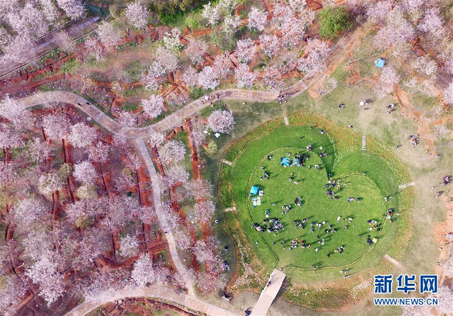 在江西南昌县凤凰沟景区,游人在樱花环抱的“心”形休息区内休憩(2017年3月26日无人机拍摄)。新华社记者 万象 摄
