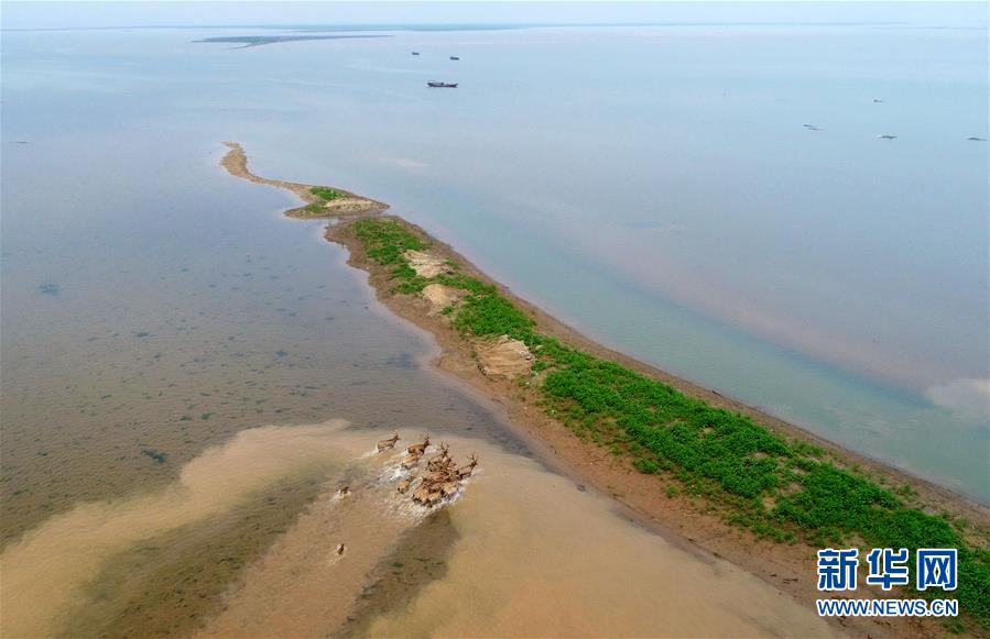 被野放的麋鹿在江西鄱阳湖湿地奔跑(2018年4月3日无人机拍摄)。新华社记者 周密 摄
