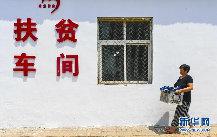6月17日,工作人员在河北省武强县豆村乡豆村的扶贫车间里搬运服装面料。 新华社记者 李晓果 摄