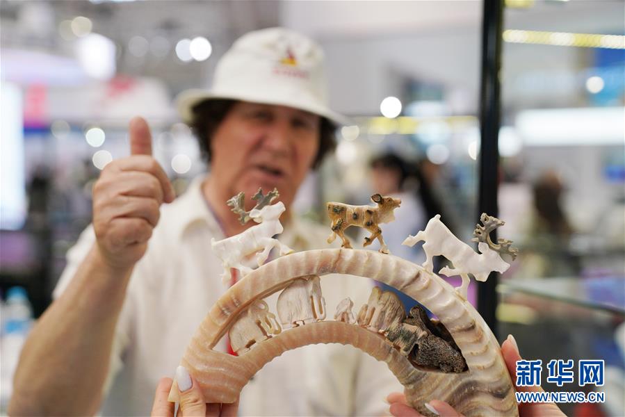 6月17日,工作人员在俄罗斯展位展示工艺品。 当日,在哈尔滨国际会展中心举行的第六届中俄博览会上,来自世界各地的精美工艺品吸引了众多参观者。 新华社记者王建威摄