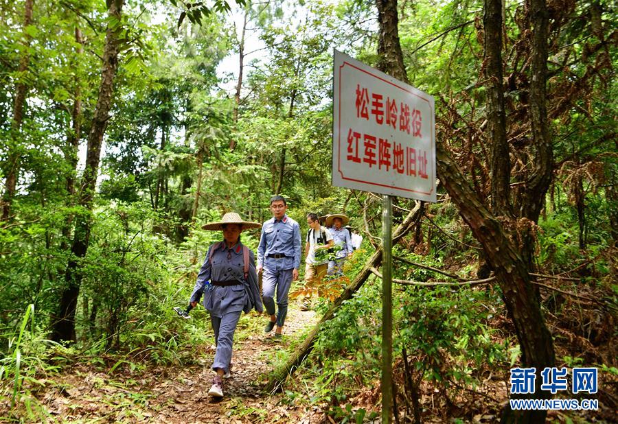 6月17日,记者们行走在松毛岭战役红军阵地旧址。新华社记者 魏培全 摄