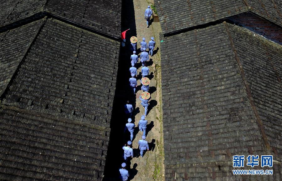 6月17日,记者们列队行进在长汀县南山镇中复村的红军街(无人机拍摄)。新华社记者 魏培全 摄