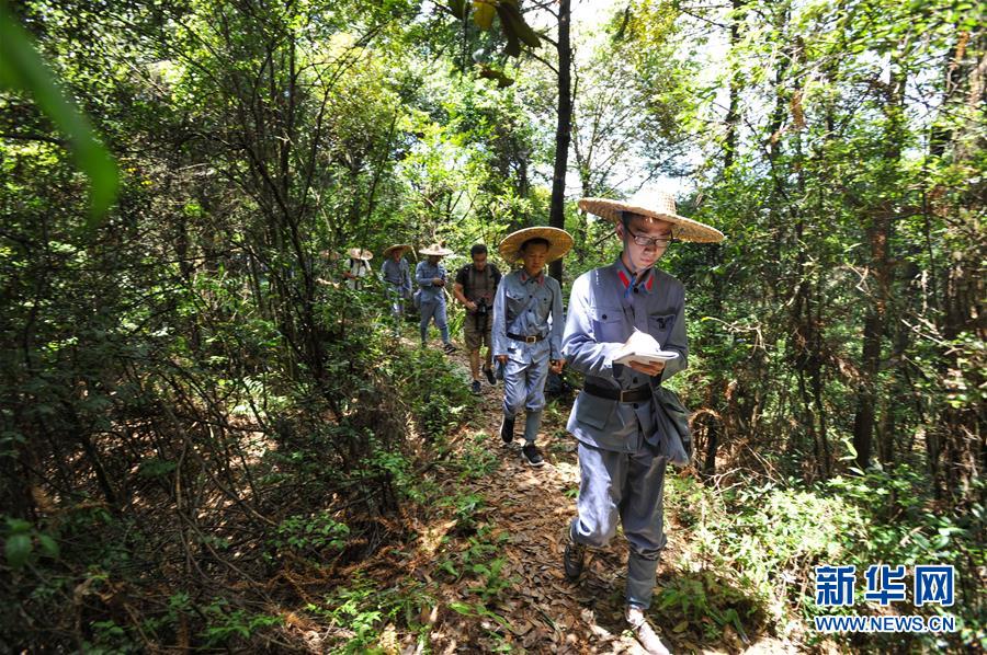 6月17日,记者们在松毛岭战役红军阵地旧址进行体验式采访。新华社记者 李任滋 摄