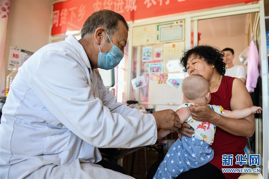 6月8日,在东壕子自然村一村民家中,韩四虎为幼儿接种疫苗。新华社记者 刘磊 摄