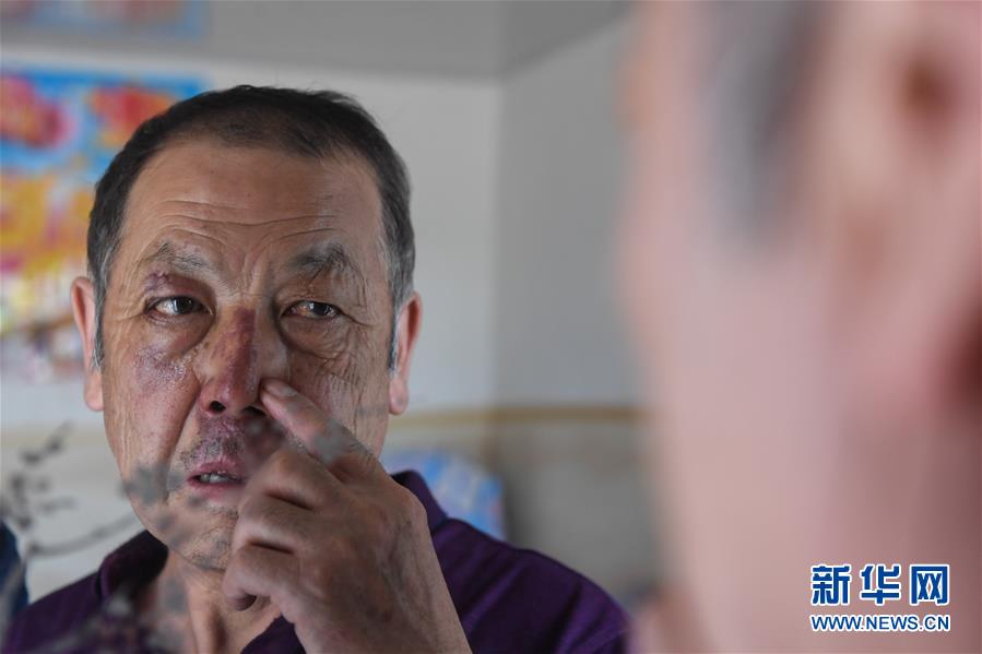 6月7日,韩四虎在家中往脸上抹药。5月份的时候,韩四虎骑摩托车下乡出诊时,意外摔倒,脸部缝了50多针。 新华社记者 刘磊 摄