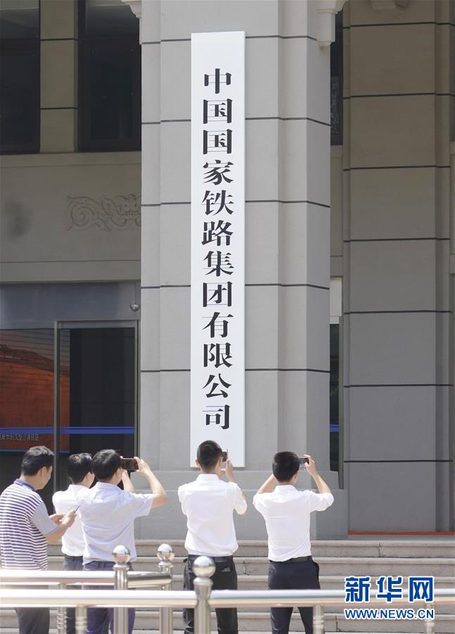 6月18日,人们在中国国家铁路集团有限公司前拍照。记者从中国国家铁路集团有限公司获悉,中国铁路总公司改制成立中国国家铁路集团有限公司,6月18日在京挂牌。公司注册资本为人民币17395亿元,以铁路客货运输为主业,实行多元化经营。新华社记者 沈伯韩 摄