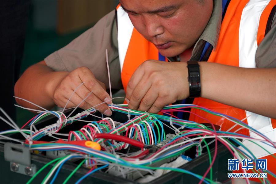 6月18日,在中铁电气化局三公司信号技术培训中心,参赛选手在进行方向盒配线绑扎。新华社记者 李安 摄