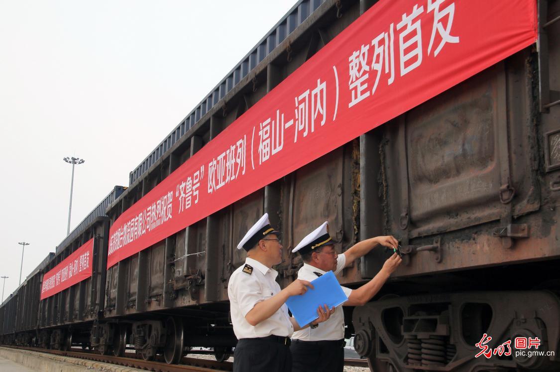 当日,首班由山东烟台福山开往越南河内的"齐鲁号"欧亚班列从济铁烟台物流园发车。该班列编组41辆,装载着电子产品和机械设备等货物,经广西凭祥口岸出境,最终抵达越南河内。(唐克摄/光明图片)