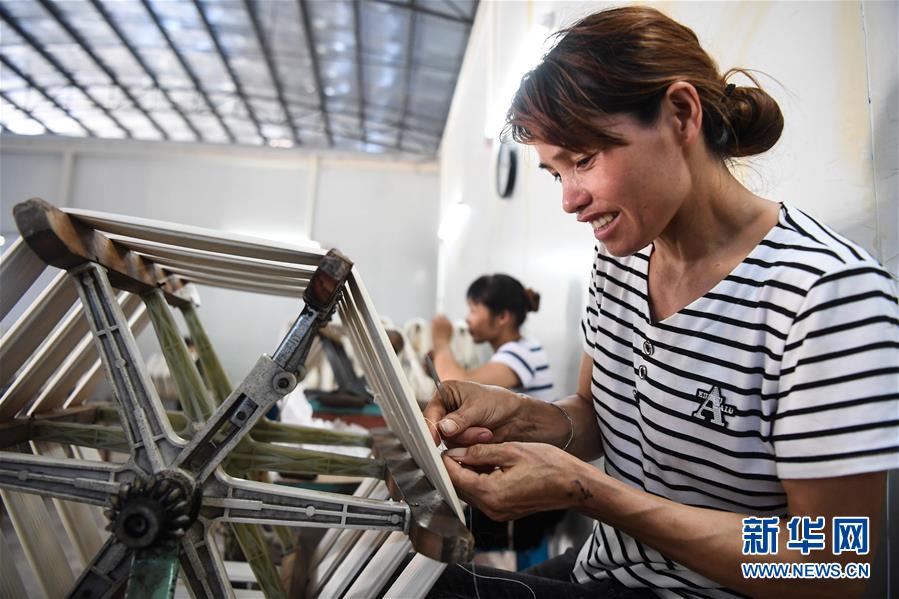 6月18日,在广西隆林县轻工业园区一家缫丝厂,来自易地扶贫搬迁安置点的群众在“扶贫车间”纺纱。 近年来,广西隆林各族自治县依托轻工业园区开办“扶贫车间”,帮助易地扶贫搬迁安置户实现家门口再就业,确保他们搬得出、住得下、能发展。 新华社记者张爱林摄