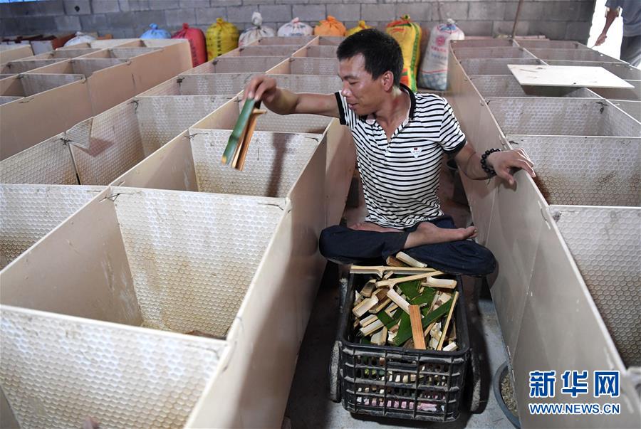 6月17日,在广西柳州市柳南区洛满镇洛河村,周益翅在养殖房里给竹鼠喂食。 新华社发(黎寒池 摄)
