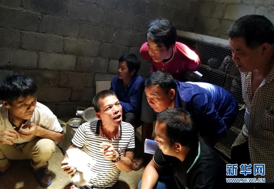 在广西柳州市柳南区洛满镇洛河村,周益翅(左二)向前来取经的贫困户介绍竹鼠养殖技术(6月13日手机拍摄)。 新华社发(黎寒池 摄)