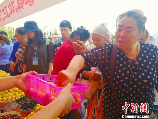 游人品尝杏子。 王小军 摄