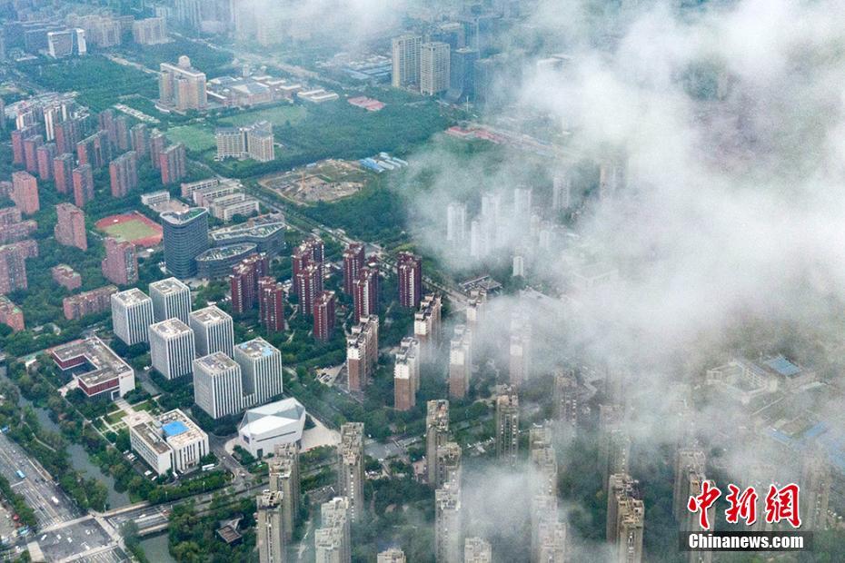 航拍雨雾缭绕的南京河西地区。泱波 摄