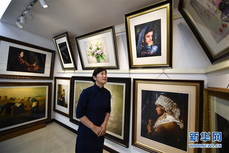 在苏州市镇湖街道苏绣小镇“琴芬绣庄”,姚惠芬在看自己的作品(6月11日摄)。 新华社记者 李响 摄