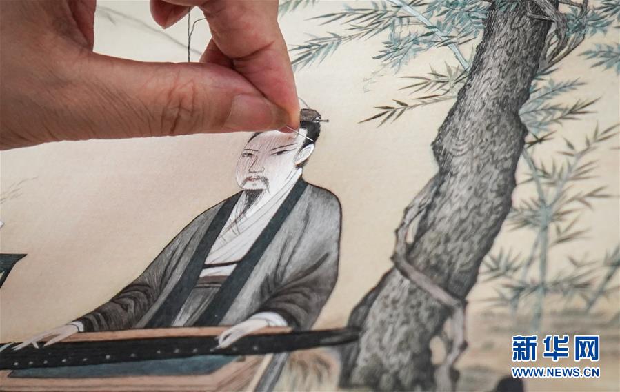 在苏州市镇湖街道苏绣小镇“琴芬绣庄”,姚惠芬在刺绣《听琴图》(6月11日摄)。 新华社记者 杨磊 摄