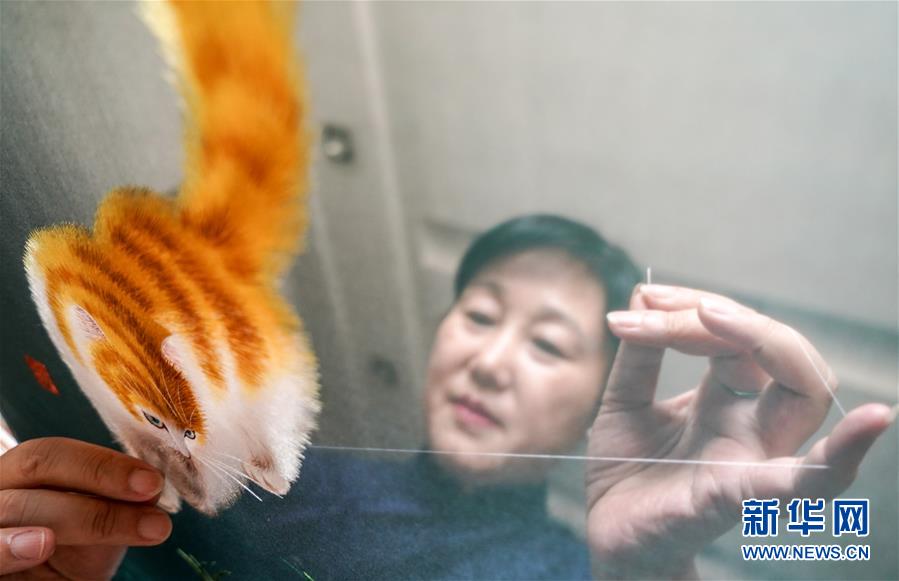 在苏州市镇湖街道苏绣小镇“琴芬绣庄”,姚惠芬在刺绣双面绣(6月11日摄)。新华社记者 杨磊 摄