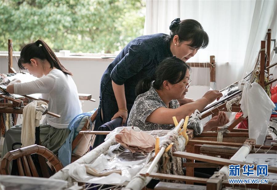 在苏州市镇湖街道苏绣小镇“琴芬绣庄”,姚惠芬(中)指导绣工创作(6月11日摄)。 新华社记者 杨磊 摄