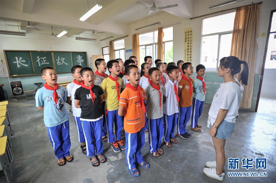 6月18日,长汀县南山中复小学学生在红色主题活动上合唱红色歌曲。 新华社记者李任滋摄