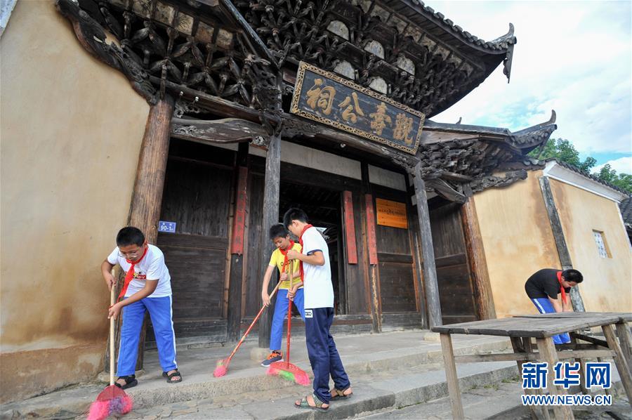 6月18日,在长汀县中复村,长汀县南山中复小学学生在观寿公祠门前打扫。新华社记者李任滋摄
