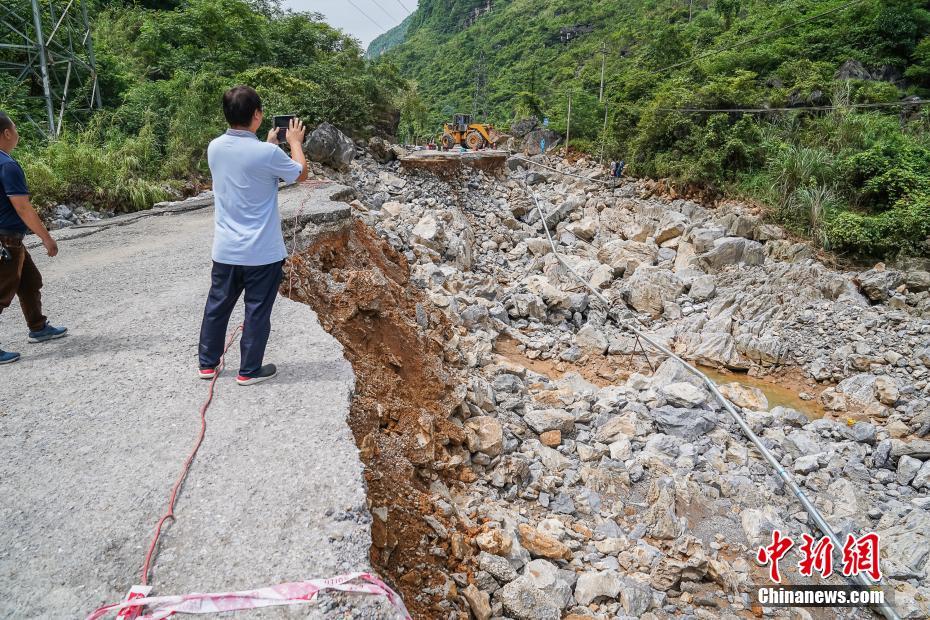 6月16日21时至17日凌晨5时,广西凌云县出现强降雨引发山洪,导致212国道2255公里处发生道路塌方,12名人员失联。图为事发现场塌方路段。中新社记者 陈冠言 摄