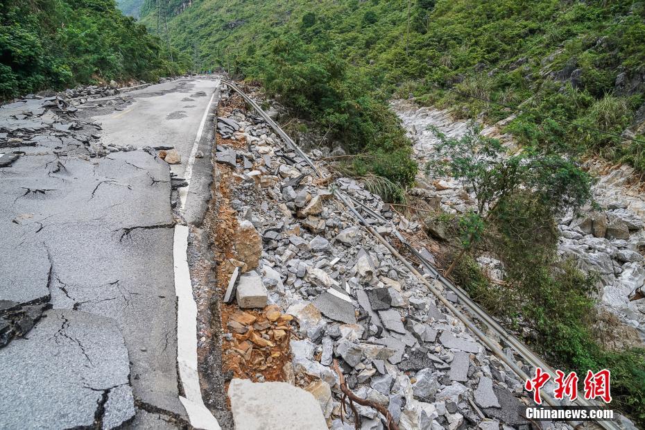 6月16日21时至17日凌晨5时,广西凌云县出现强降雨引发山洪,导致212国道2255公里处发生道路塌方,12名人员失联。中新社记者 陈冠言 摄
