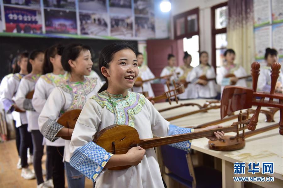 6月19日,贵州省黔东南苗族侗族自治州榕江县乐里中学,学生在弹唱侗族琵琶歌。 近年来,贵州省黔东南苗族侗族自治州榕江县各民族学校积极开展“民族民间文化进课堂”活动,开设侗族琵琶歌、瑶族歌舞、水族芦笙、苗族腊染等传承班,既让学生们在富有民族特色的教学中快乐学习,又使民族文化在校园里得到传承。 新华社发(蒋佐仙 摄)