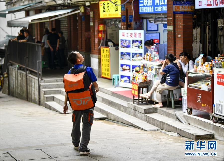 6月19日,幸银银在一栋老式楼房前查看门牌,核对下单地址。 新华社记者 刘潺 摄