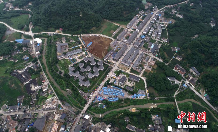 6月20日,四川长宁6.0级地震第四天,震中双河镇双河中学运动场受灾民众临时安置点秩序井然,帐篷区全部通电,排水沟、移动厕所等均已到位。图为航拍震中双河镇四周空旷地带建起的受灾民众安置点。中新社记者 刘忠俊 摄