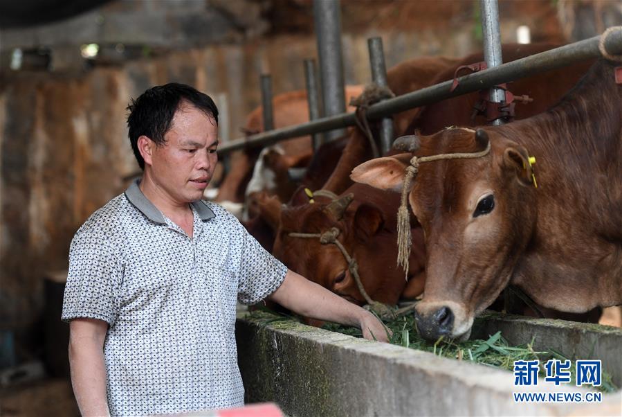 在广西都安瑶族自治县隆福乡隆旺村三叉屯,罗仕林在喂牛(4月24日摄)。新华社记者陆波岸 摄