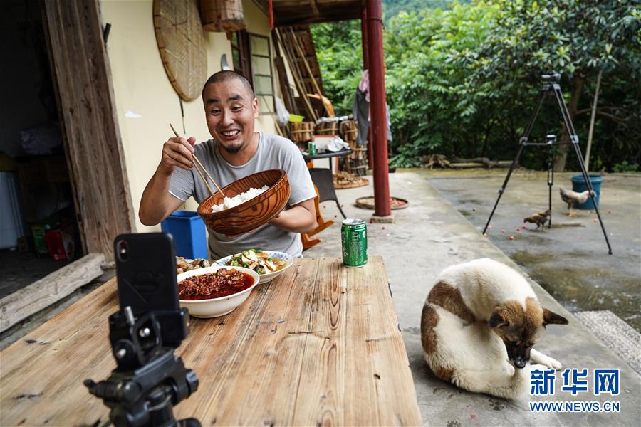6月19日,蒋金春在家门口进行一场“吃播”,推介家乡的油浸鱼。 新华社记者 周密 摄