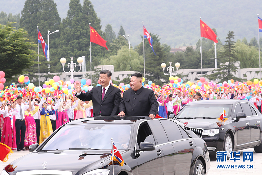 6月20日,中共中央总书记、国家主席习近平乘专机抵达平壤,开始对朝鲜民主主义人民共和国进行国事访问。朝鲜劳动党委员长、国务委员会委员长金正恩和夫人李雪主到机场热情迎接习近平和夫人彭丽媛。朝方在机场举行隆重欢迎仪式。欢迎仪式结束后,习近平与金正恩同车前往锦绣山太阳宫广场,沿途数十万群众夹道欢迎。 新华社记者 鞠鹏 摄