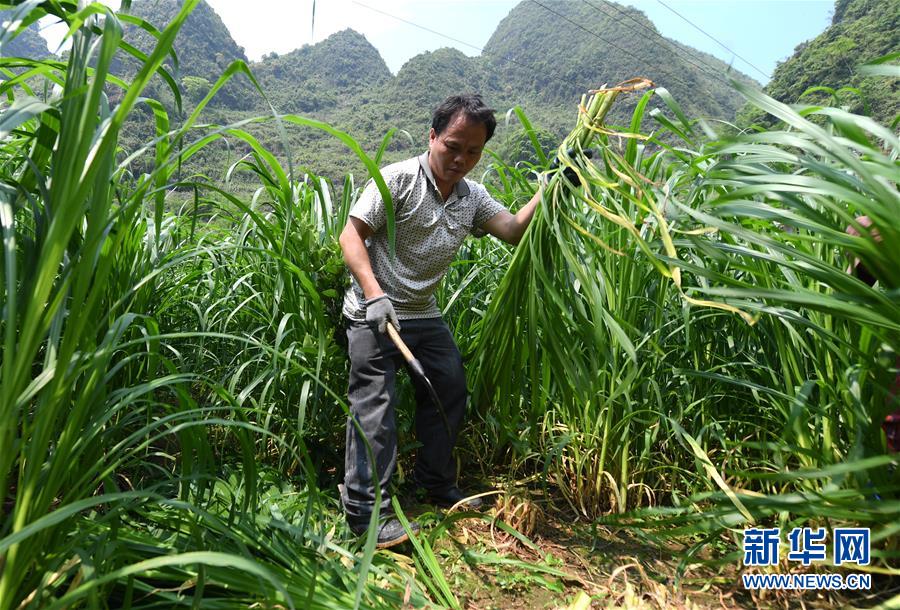 在广西都安瑶族自治县隆福乡隆旺村三叉屯,罗仕林在割牧草(4月24日摄)。新华社记者陆波岸 摄