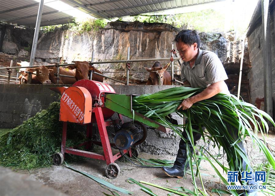 在广西都安瑶族自治县隆福乡隆旺村三叉屯,罗仕林在粉碎牧草准备喂牛(4月24日摄)。新华社记者陆波岸 摄