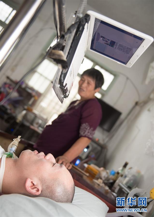 6月19日,在临海市古城街道松一村的家中,父亲李士满、母亲钱春芳和病榻上的李卓君合影。 新华社记者翁忻旸摄