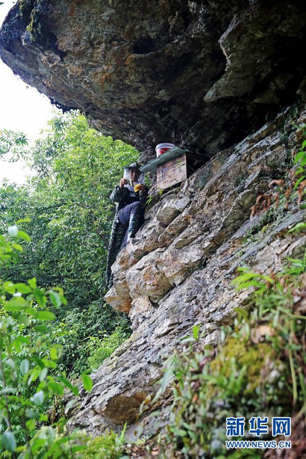 6月20日,在广西柳州市融水苗族自治县汪洞乡罗洞村,村民韦锦军在悬崖上采割夏至蜜。 时下,正是夏至蜜成熟的季节,广西柳州市融水苗族自治县汪洞乡罗洞村的蜂农们忙着采割夏至蜜,大山里一片忙碌景象。 新华社发(龙涛 摄)