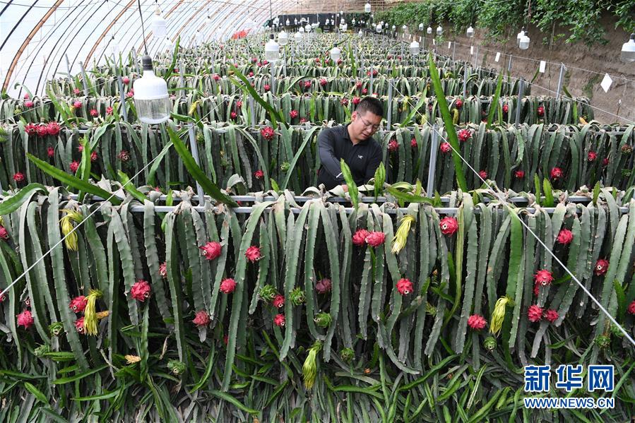 6月21日,在张掖市甘州区长安镇万家墩村,村民王亚东在采摘火龙果。 近日,甘肃省张掖市甘州区农民在日光温室大棚种植火龙果喜获丰收。据介绍,火龙果苗从广西引进,经过三年的培育种植,今年进入盛果期,预计每个大棚年产火龙果近万斤,产品远销宁夏、青海等地。 新华社记者 范培珅 摄