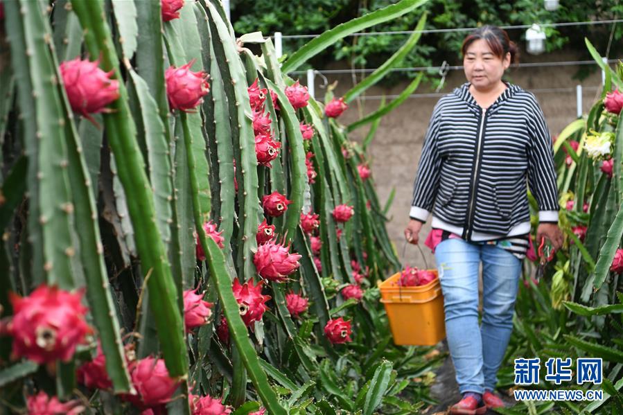 6月21日,在张掖市甘州区长安镇万家墩村,村民张爱芳收获火龙果。 近日,甘肃省张掖市甘州区农民在日光温室大棚种植火龙果喜获丰收。据介绍,火龙果苗从广西引进,经过三年的培育种植,今年进入盛果期,预计每个大棚年产火龙果近万斤,产品远销宁夏、青海等地。 新华社记者 范培珅 摄