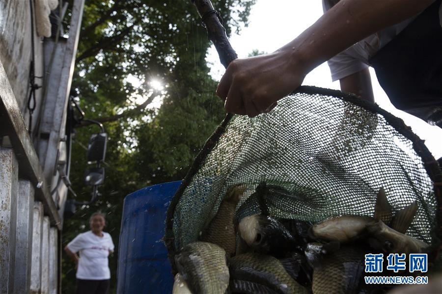 6月21日,贵州省毕节市黔西县洪水镇解放村村民在领取幼鱼。 新华社发(史开心 摄)
