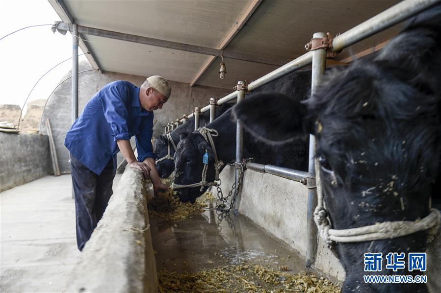宁夏固原市原州区炭山乡南坪村村民丁永军在给牛添加草料(5月13日摄)。 新华社记者 冯开华 摄