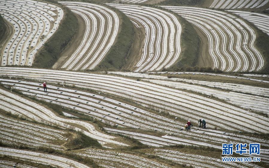 农民在宁夏固原市彭阳县金鸡坪梯田公园进行覆膜种植(5月15日摄)。 新华社记者 冯开华 摄