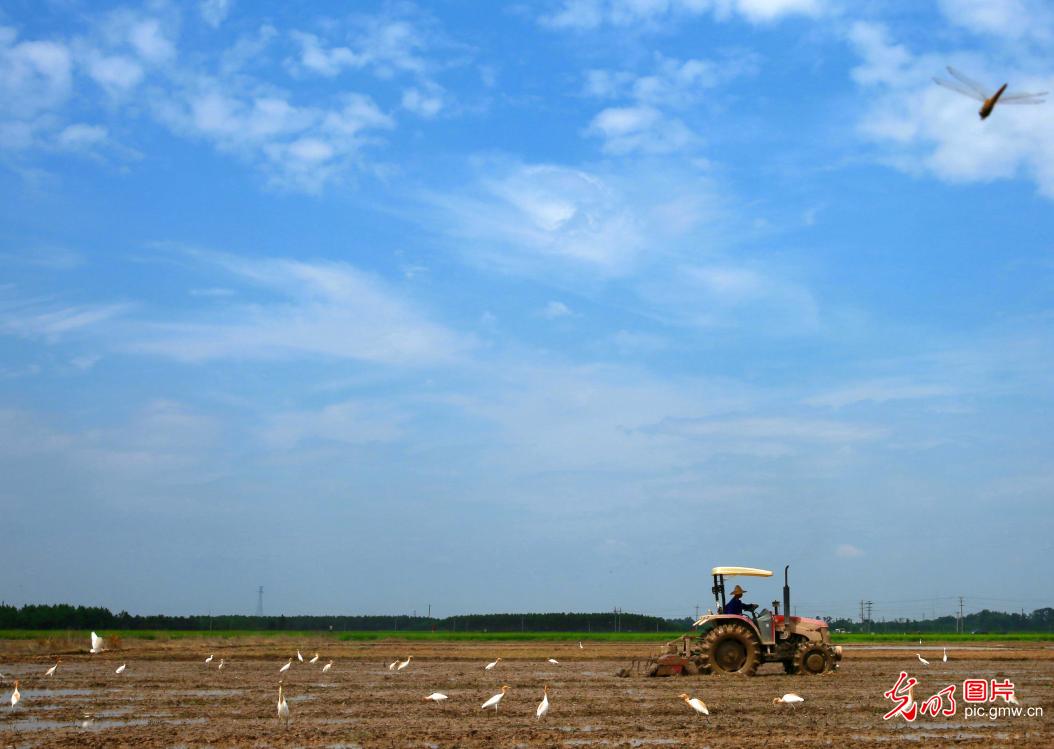 6月20日,在江西省泰和县沿溪镇仓岭村农田里,成群的白鹭聚集在刚翻耕的农田里嬉戏觅食。农民翻耕农田,成群白鹭相伴,和谐共处,相映成趣。(司马天民摄/光明图片)