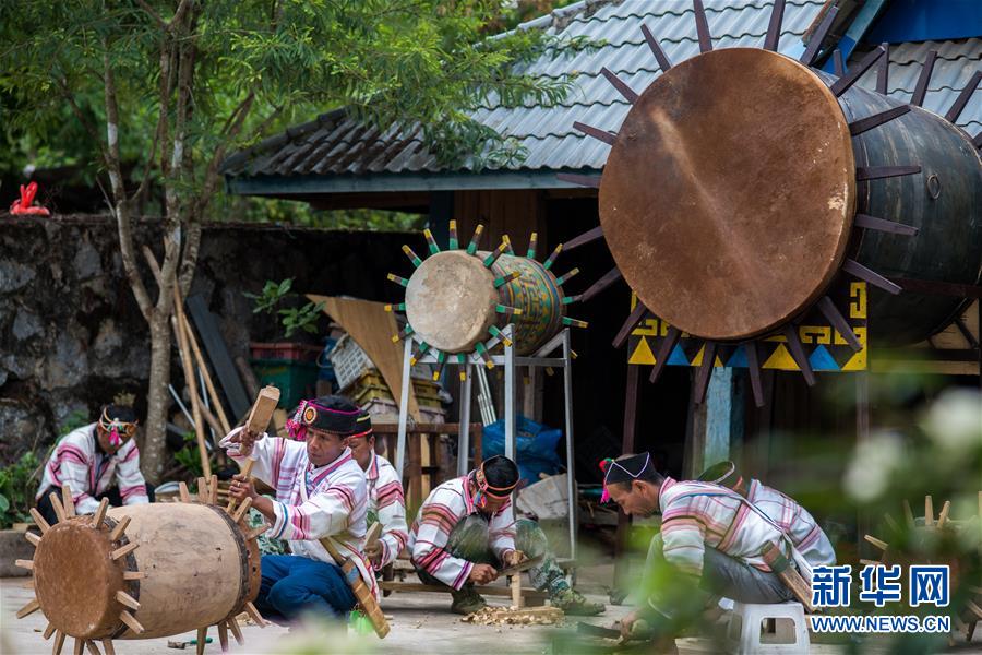 6月14日,合作社的村民在制作基诺大鼓。新华社记者 胡超 摄