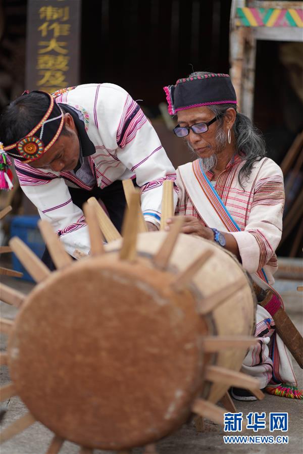 6月14日,白腊先(右)指导合作社村民制作基诺大鼓。 新华社记者 秦晴 摄