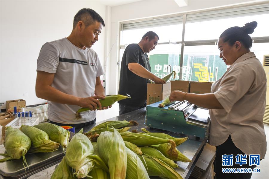 6月21日,河北唐山遵化市遵化镇一家合作社的工作人员在将玉米装箱准备外销。新华社发(刘满仓 摄)