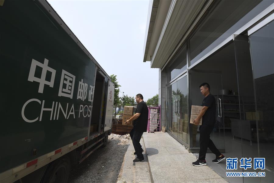 6月21日,在河北唐山遵化市娘娘庄乡,邮政快递工作人员将揽收的农产品装车准备外运。新华社发(刘满仓 摄)