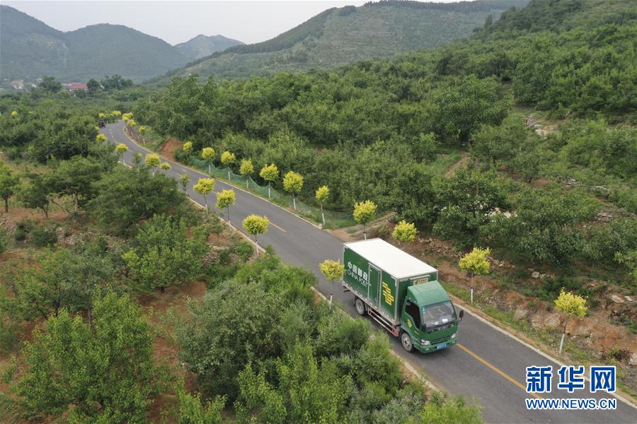 6月21日,邮政快递车行驶在河北唐山遵化市娘娘庄乡的山村公路上(无人机拍摄)。新华社发(刘满仓 摄)