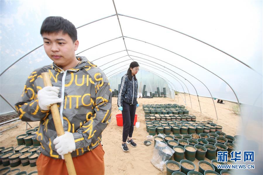 5月27日,北京林业大学的学生李鹭辰(右)在沙泉湾治沙示范区察看温室盆栽植物。通过治理,该示范区内林草覆盖率由10%提高到超过50%,显著改善了生态环境。 新华社记者 丁洪法 摄