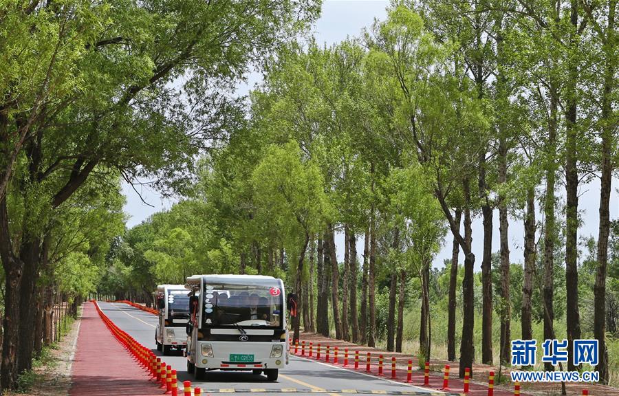 5月27日,游客在宁夏盐池县哈巴湖自然保护区乘车游览。经过治理的哈巴湖自然保护区草木丛生,绿意盎然。 新华社记者 丁洪法 摄