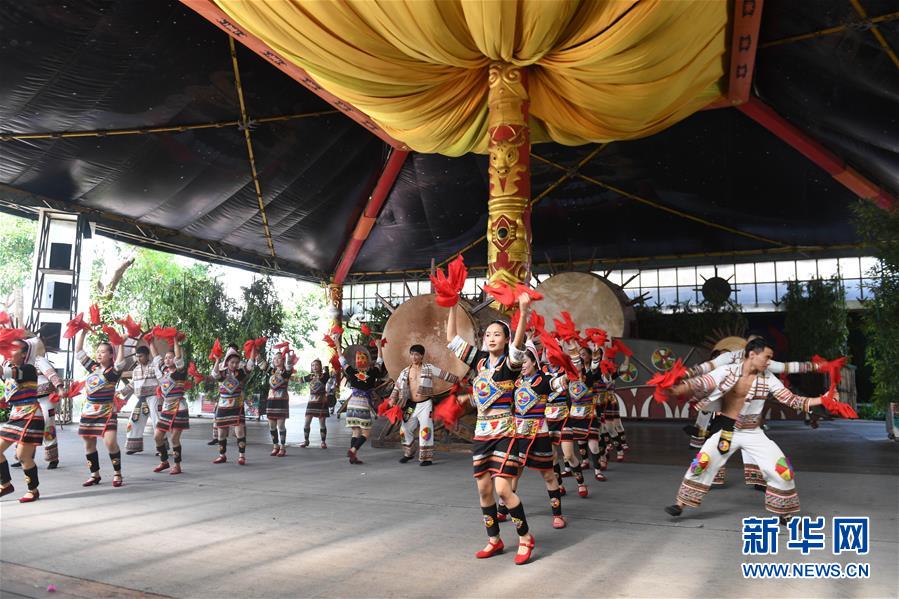 在云南省景洪市基诺山寨景区,演员在表演基诺大鼓舞(6月10日摄)。 新华社记者 秦晴 摄