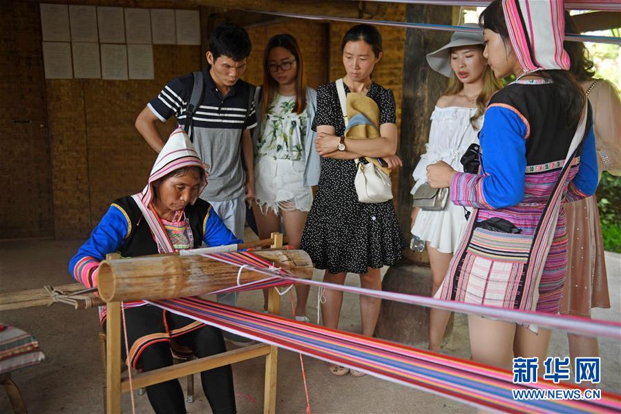 在云南省景洪市基诺山寨景区,游客在观看基诺族群众腰则用传统方法织布(6月10日摄)。 新华社记者 秦晴 摄